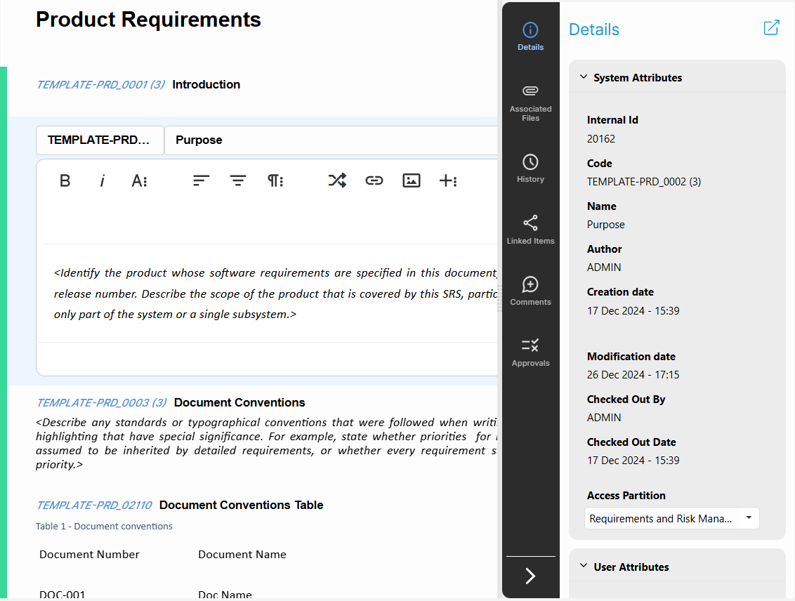- Where all your documents are located. Open your Product Requirements and explore the ribbon. Elements are clickable and have details! click on of the requirements and access to see details using the right panel