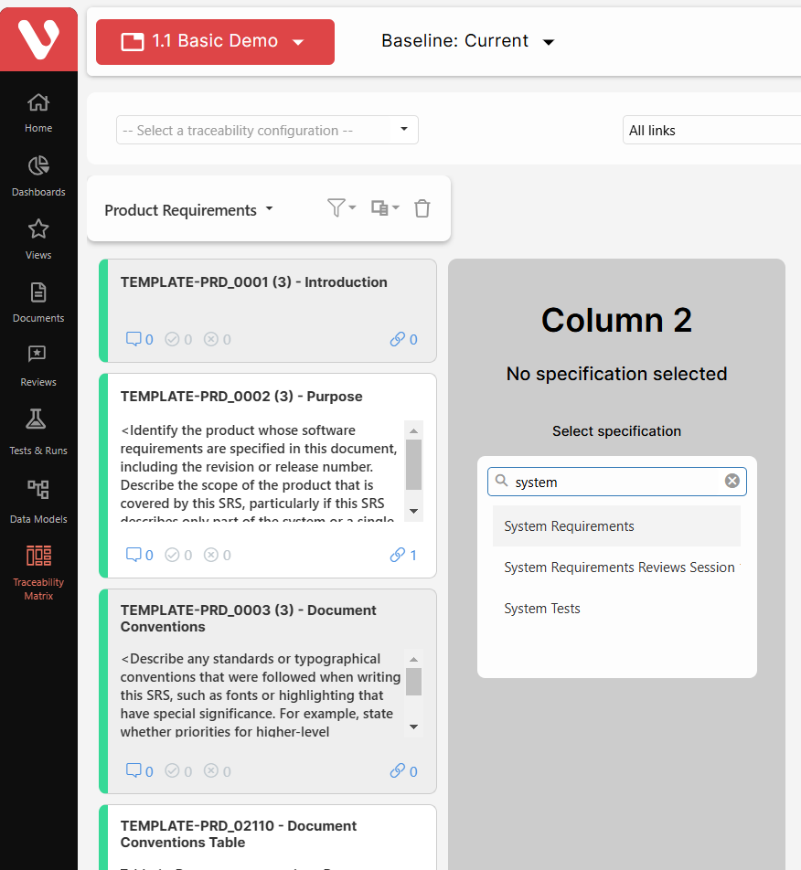 - Look for the Traceability Matrix option in the left toolbar and create a new traceability matrix:
