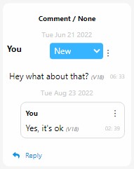 To reply to a comment, users may do so inline from the Document View or from the Comments tab in the Properties panel. In either case, go to the comment you want to reply to and click on reply at the bottom of the comment: