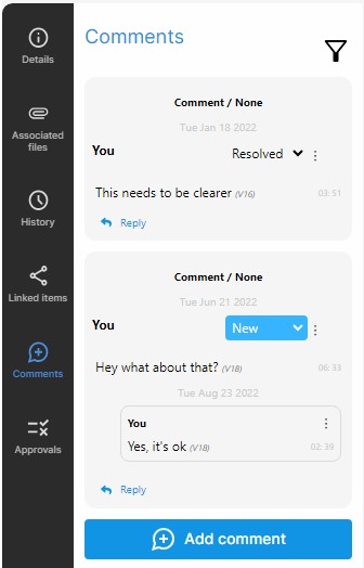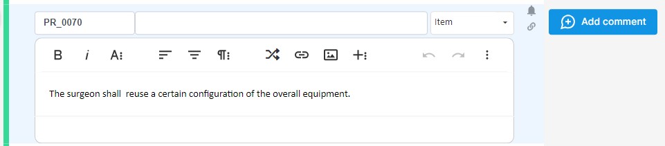 To add a comment in the Document view, select the item and click on the Add comment button.