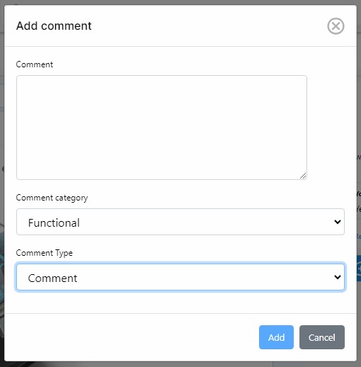Either inline or through the Comments tab, when clicking on the Add comments button a dialog box will appear: