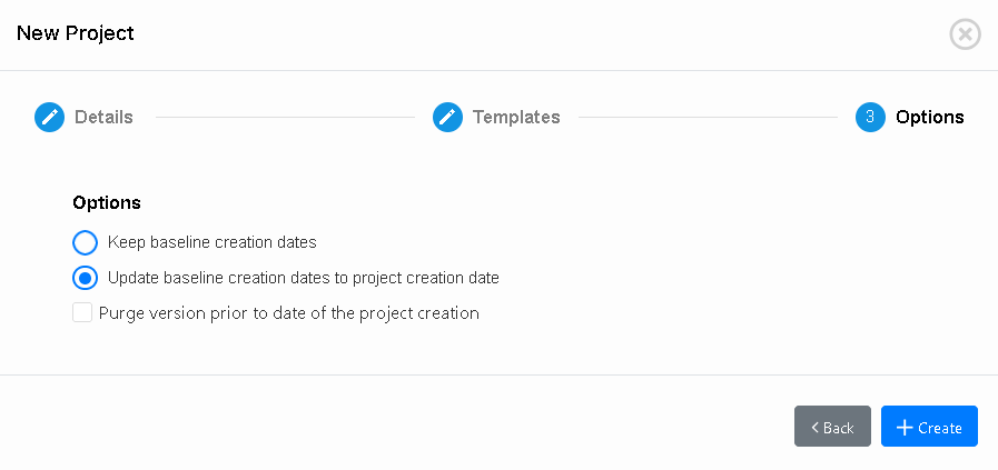 • Keep baseline creation dates: This option will keep the original dates as in the selected template. For instance, if a baseline was created in the original project several years ago, it’ll appear as such in the projects that use this template.