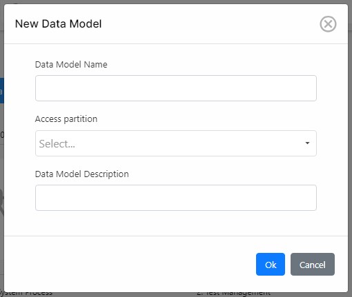 Project managers will be able to create new data models by clicking on the button. This will display the following dialog box in which the user will have to enter: