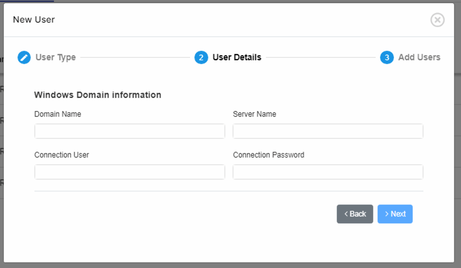 To create a User of this type, fill in the information related to the Windows Domain where the users are located and click on Next.