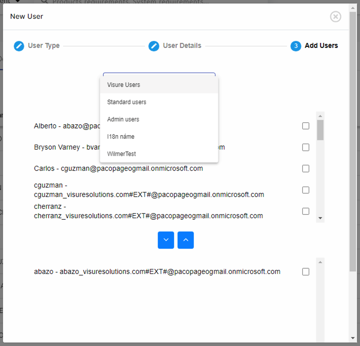 Select the users you would like to add/remove to Visure and click on A blue square with a white arrow