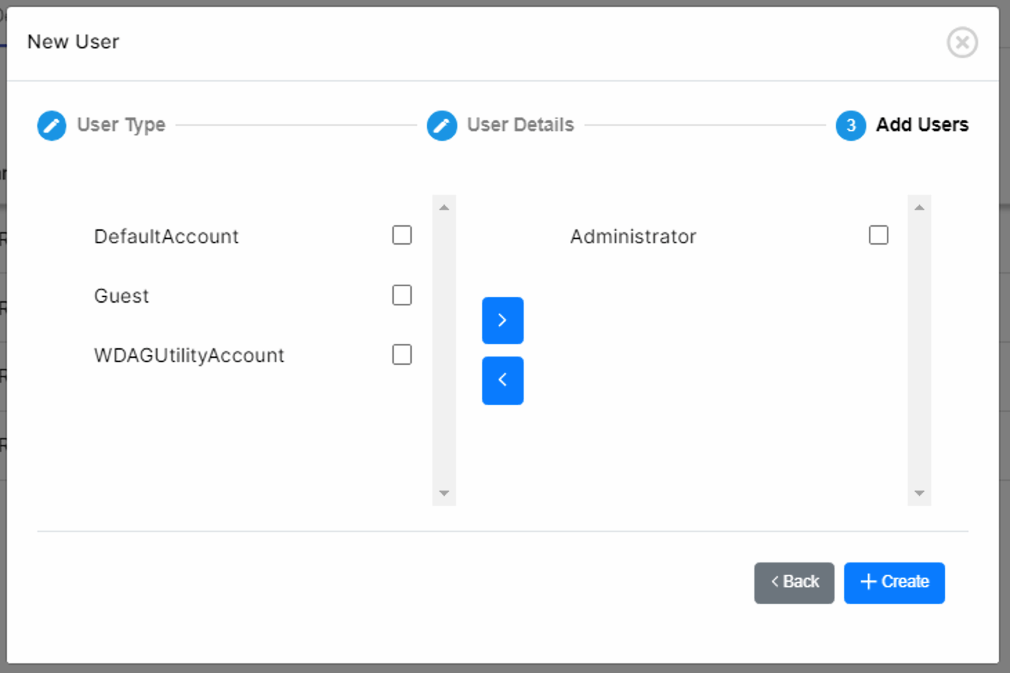 In order to create users, click on the Add user button. A dialog window will appear where the user will be able to select the user type: