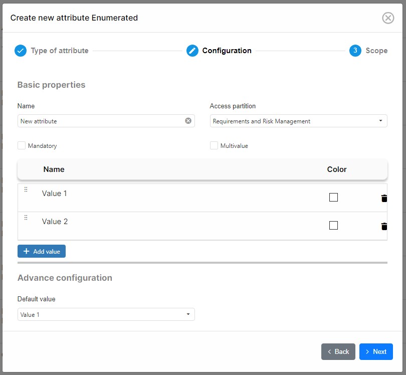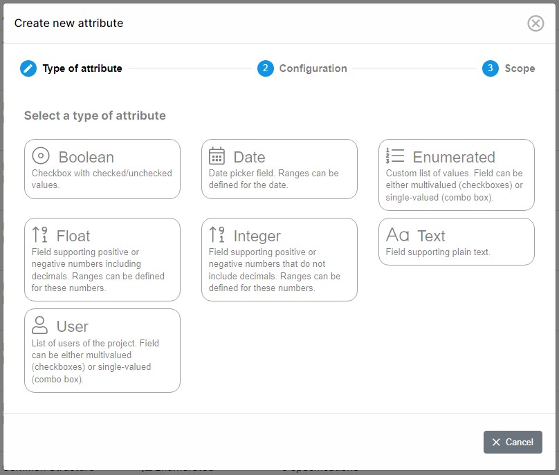 1. Type selection – The users can select from a wide variety of attribute types, from text, date, boolean, user or enumerated.