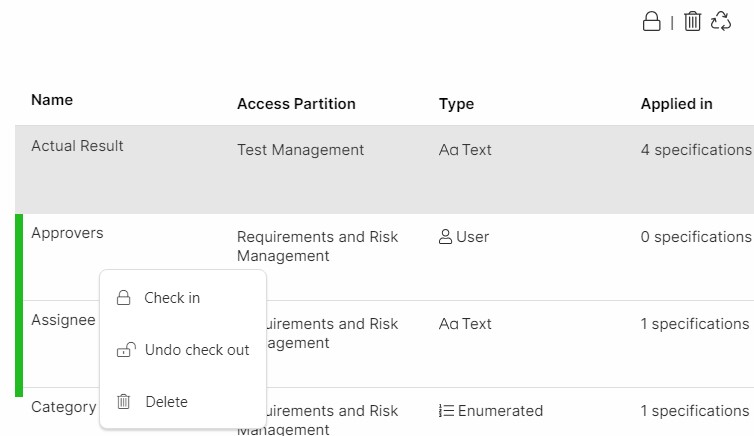 Attributes can be checked in and out, like any other element in Visure.  These options will appear at the top of the screen, as well as in the context menu when right-clicking on top of the attributes.