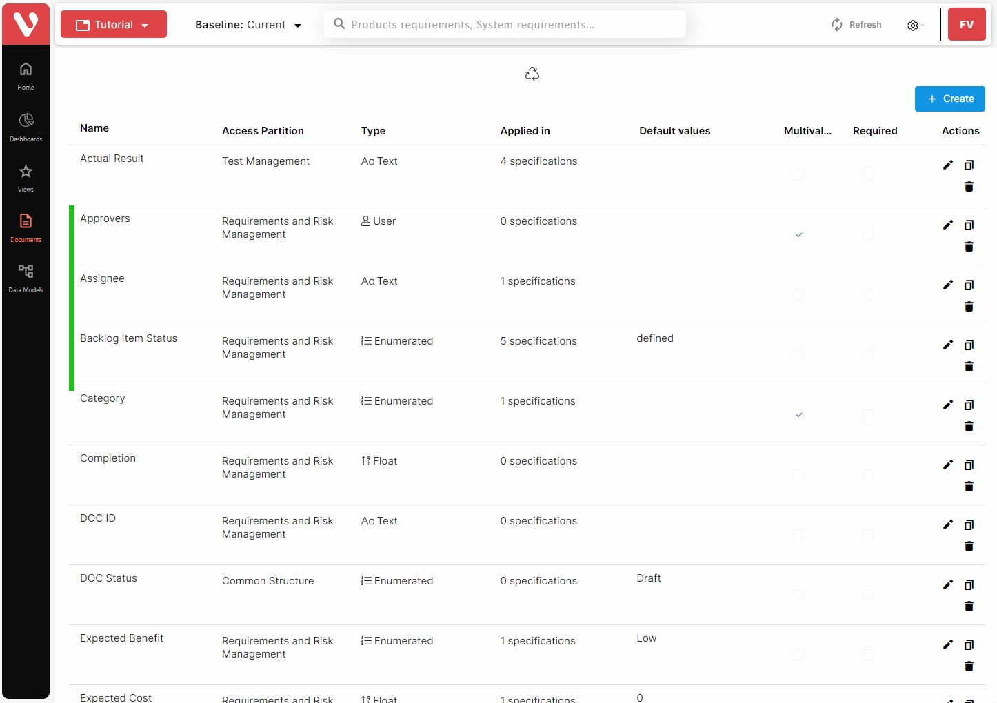 Visure Authoring will display the complete list of attributes with information on the type, access partition, scope, default values and other information: