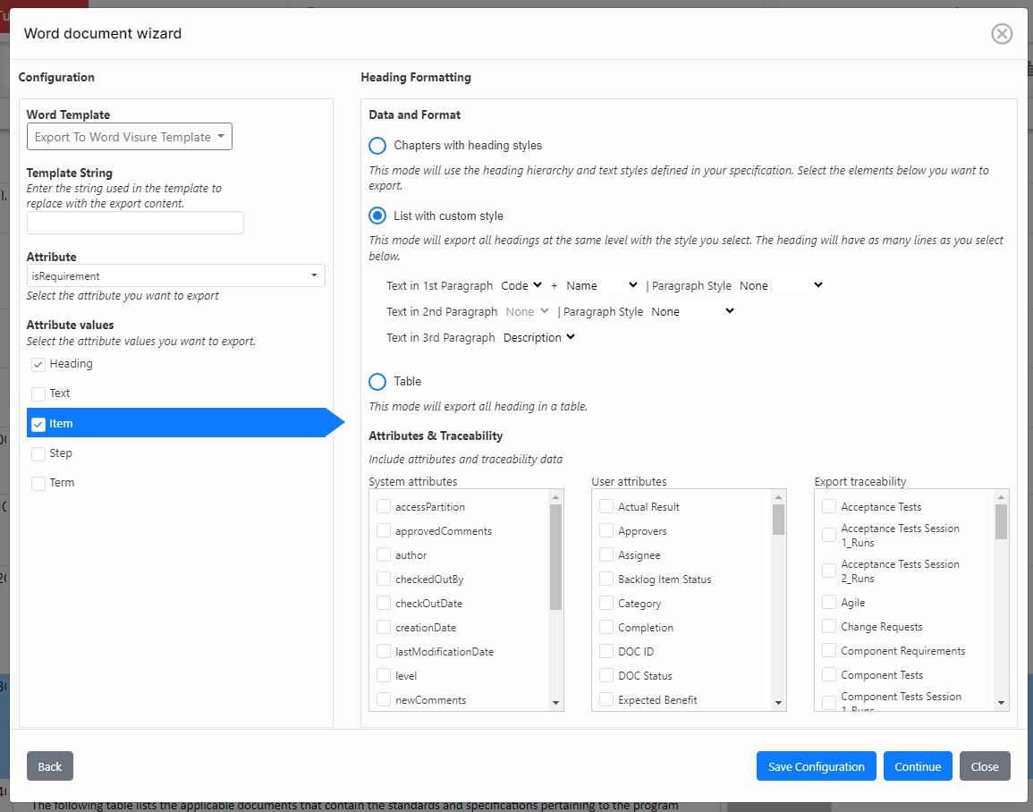 - Select the attribute to identify the element types for which the export will be configured. For instance, an attribute such as isRequirement can be used, with values such as Heading, Item or Text, for which different characteristics for the export can be defined.