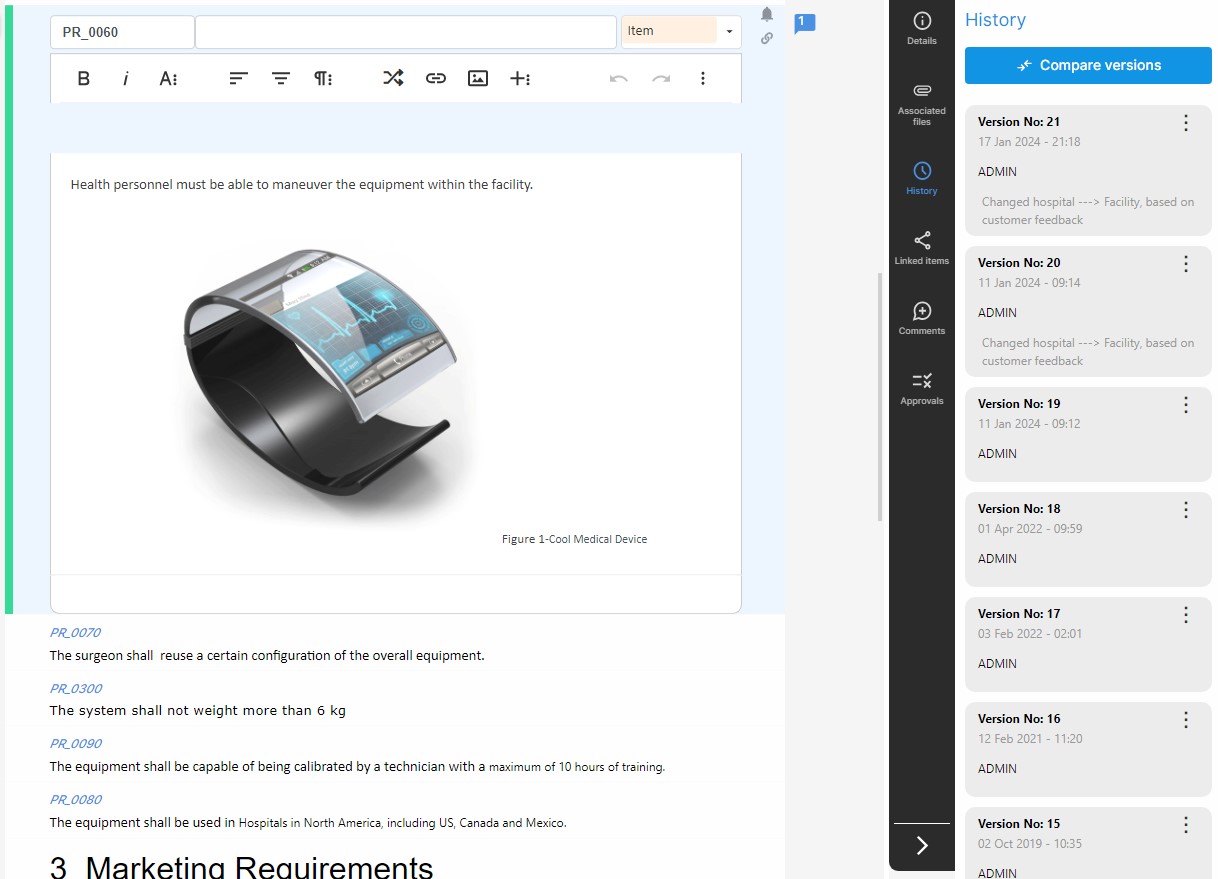 Users may compare versions by either clicking on the Compare versions button that will enable