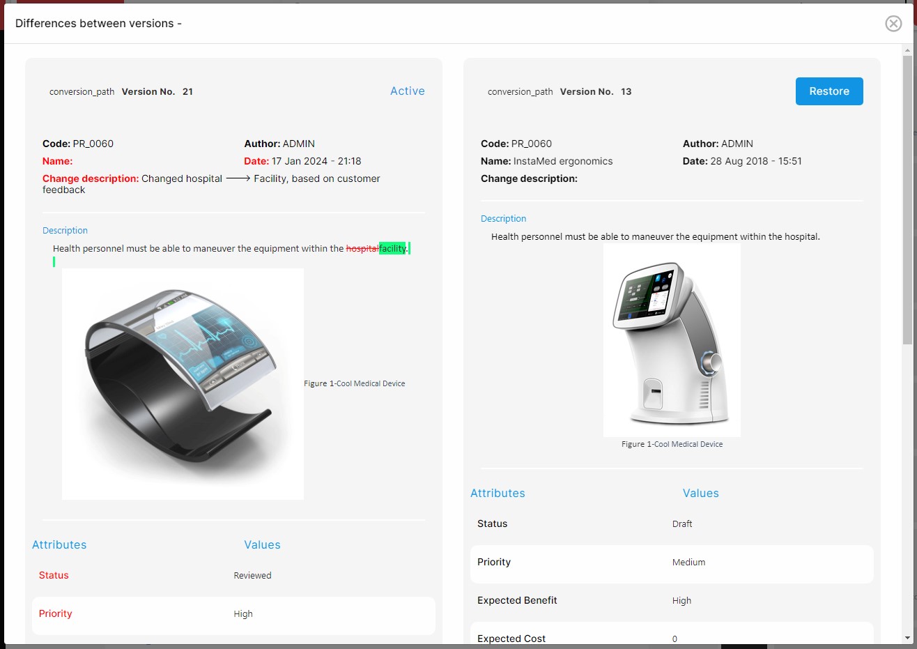 users to select two separate versions, or through the more options icon () associated to the version and selecting Compare with current. This will display a pop-up window with the differences between the selected versions: