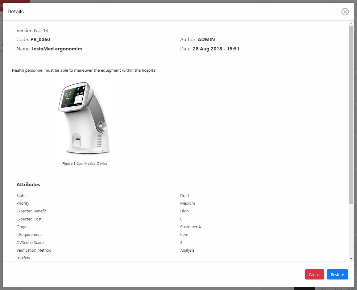 To restore a previous version of an item, click on the more options icon ()associated to the version to be restored and select Restore. Alternatively, you can also click on Restore when displaying more information on a specific version or when comparing versions.