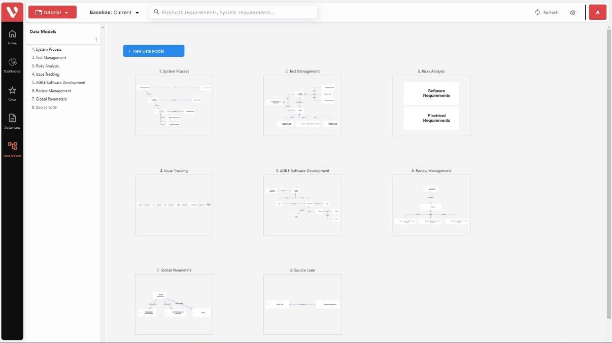 In this page the list of data models available in the project is shown in a list to the left of the screen (Browser) and as thumbnails in the center of the screen. From this view the user can navigate through the data models.