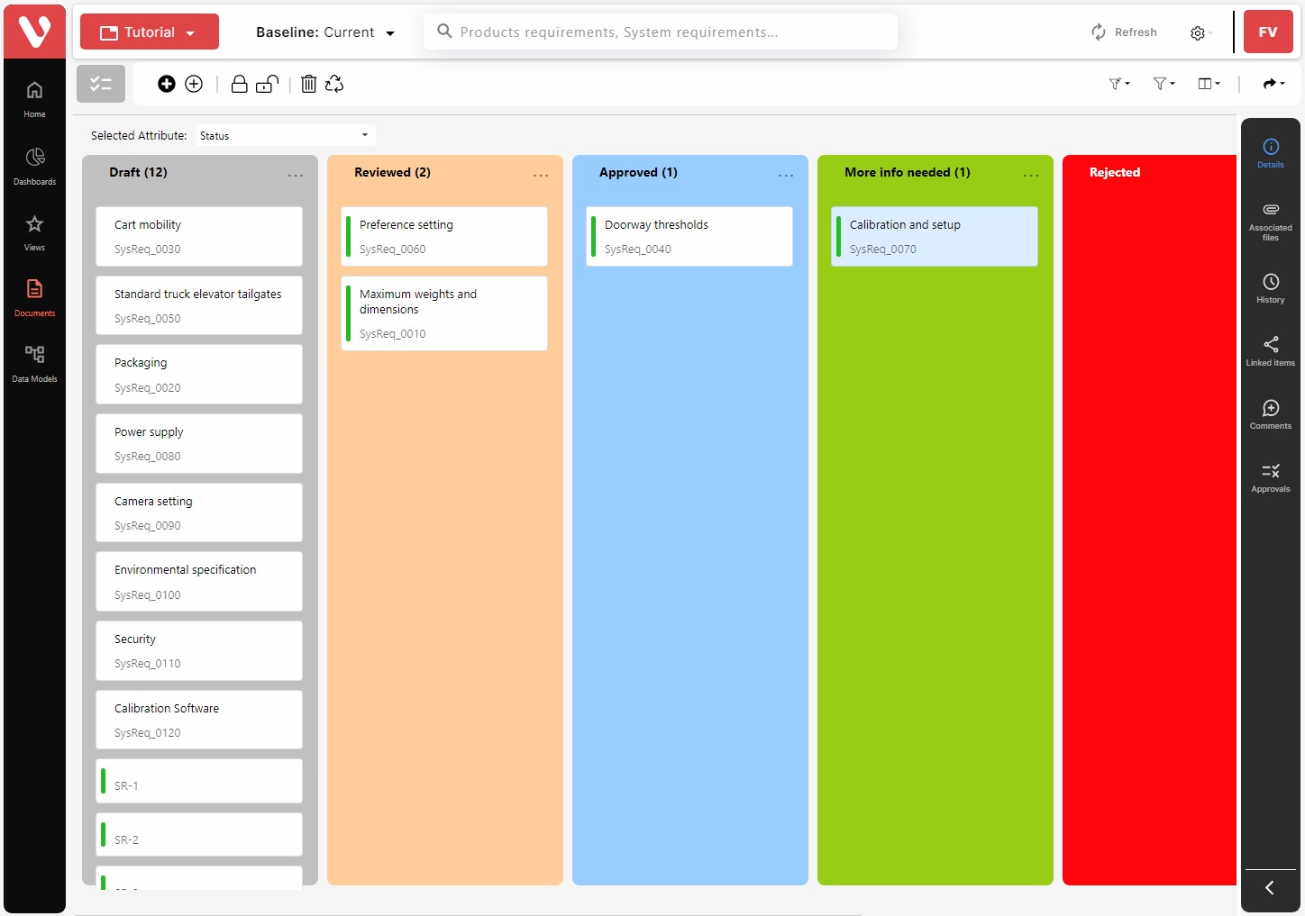 In the grid, the items belonging to the selected document are displayed in a Kanban Board.