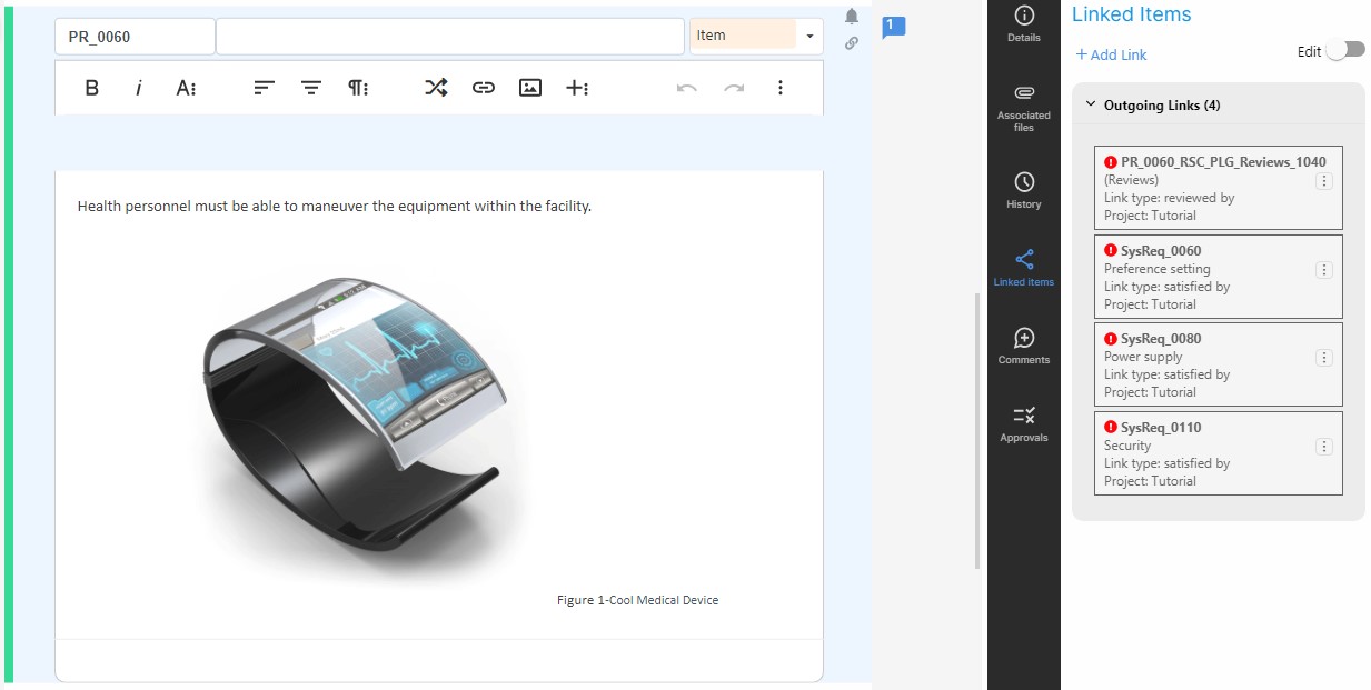 To navigate to a linked item, click on the code of the linked item. If the linked item belongs to more than one specification, select the specification that should be opened to display the item.