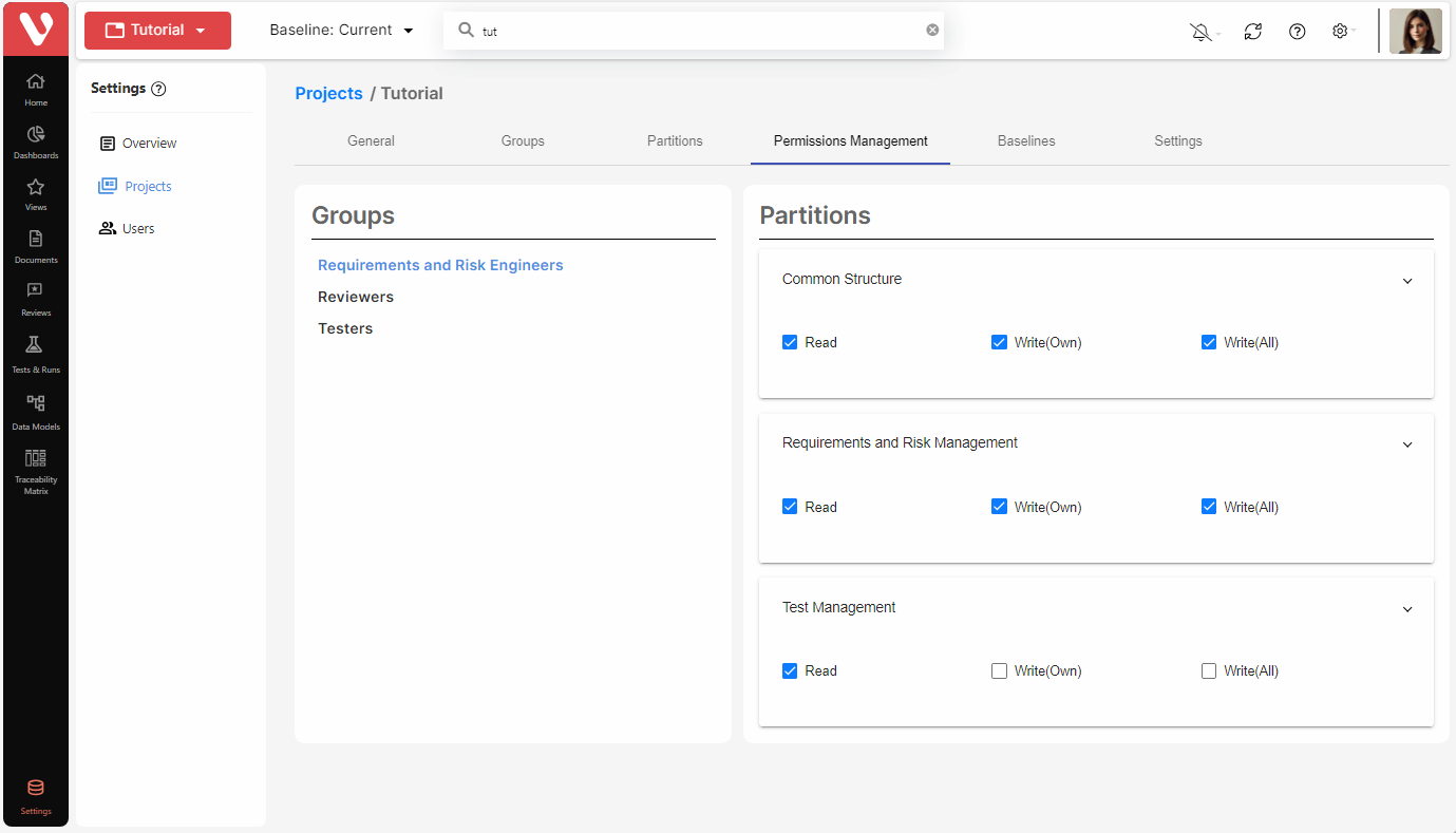 The permissions are defined at project level. Thus, a user of the Visure database may have different permissions on different projects in the Visure database.