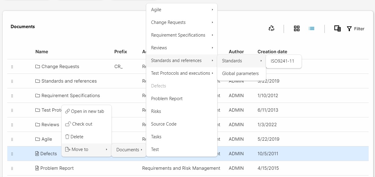 Alternatively, users can right-click and select the Move to option. This option will display the hierarchy of documents in the project and will allow the user to locate it anywhere. The document will be located inside the selected element. Therefore, if the user clicks on top of Component Requirements, the element will be moved inside this folder. If the user clicks on the first level Documents option, it will be displayed in the first level of hierarchy, without a parent folder.